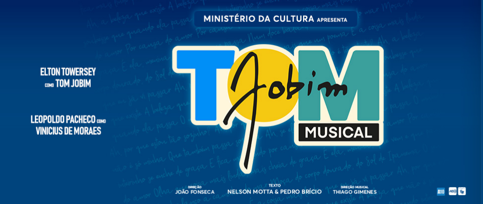 Tom Jobim Musical é apresentado pelo Ministério da Cultura, com patrocínio MAPFRE, apoio UNISYS, realização Atual produções, Bonus Track, Governo do Brasil, do lado do povo brasileiro.